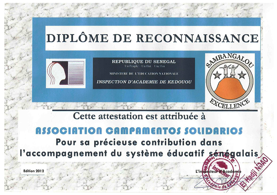 Date of constitution : 25 March 2002 Date of registration in the Ministry of Interior: 29 February 2004 / National number: 172023 Registration as NGO in the Cooperation and Development Spanish Agency (AECID): 11 December 2006 Legalization of the Association in Senegal: 2 May 2007 Declaration of Public Good in Spain: 24 July 2008 |