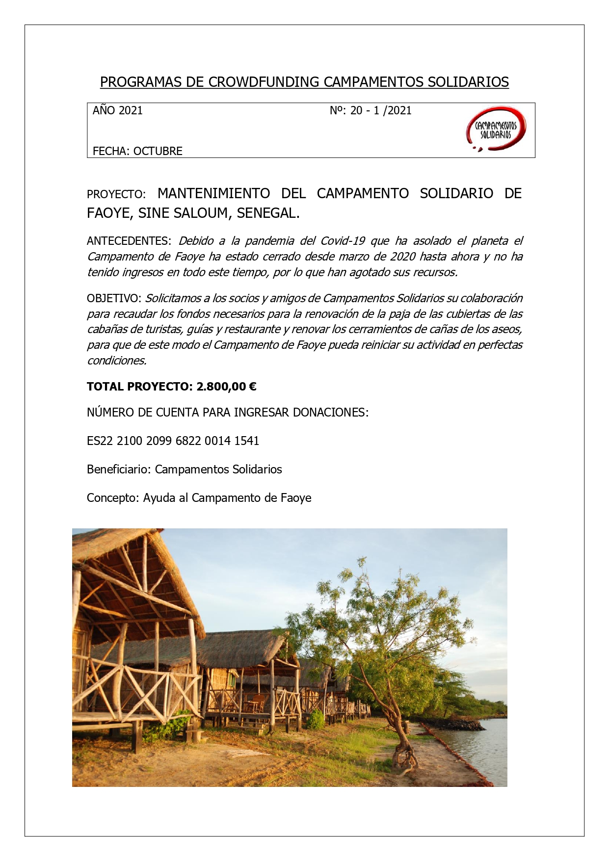 CF 20: Maintenance of Faoye Solidarity Camp, Sine Saloum, Senegal COMPLETED [+]