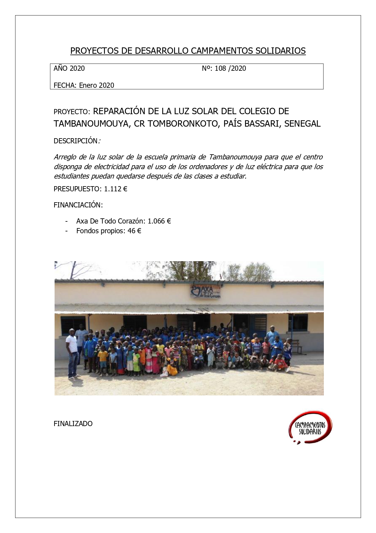 P 108: Reparación de la luz solar de la Escuela de Tambanoumouya, Comunidad Rural de Tomboronkoto, País Bassari, Senegal [+]