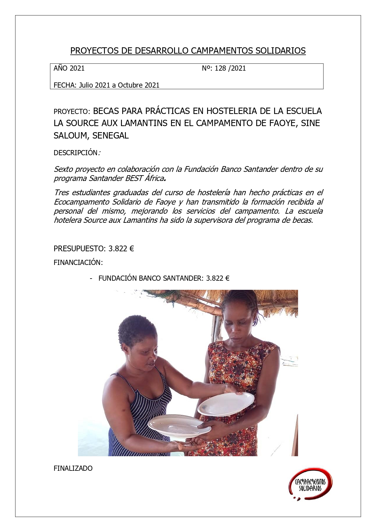 P 128: Becas para prácticas en hosteleria de la escuela la Source aux Lamantins en el Campamento de Faoye, Sine Saloum, Senegal [+]
