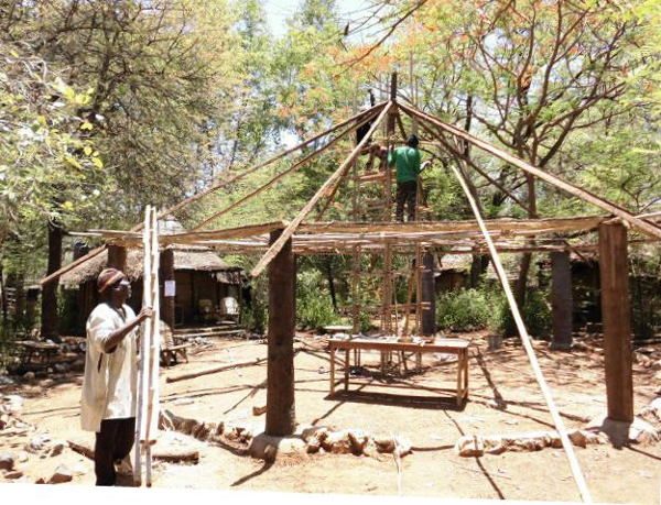 Después de 10 años, hemos tenido que cambiar los grandes troncos de palmera que hacían de pilares en la choza central del Campamento de Badián . Las termitas se comían la base enterrada y la estructura empezaba a ceder. Makhan Cámara , gerente del campamento, organizó las obras con la ayuda de Moussa , responsable del mantenimiento y decoración del campamento. Los excelentes carpinteros Bassaris , volvieron a reconstruir la cubierta con caña trenzada y paja.