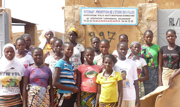 Ya son 10 años trabajando en Mali. Desde aquel primer viaje de prospección desde el Campamento de Badian al País Dogón, en el año 2006, no hemos parado de realizar proyectos de cooperación impulsados por Mr. Agustin Togo, profesor de la Escuela de Bandiagara. En el 2015 se formó la asociación de padres “Diangu Ire” (más vale estudiar) para facilitar un internado escolar a las chicas de poblados del País Dogón para continuar los estudios de secundaria en su capital, Bandiagara. Aunque no hemos conseguido todavía financiación para su construcción, hemos empezado el curso 2016-2017 en una instalación provisional para 24 alumnas de más de 10 poblados diferentes. Lo hemos podido financiar mediante la convocatoria de ayudas realizada por la empresa inglesa “Clifford Chance”. En la imagen, las alumnas del nuevo internado. (ver más imágenes)