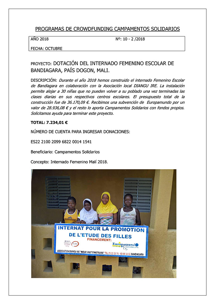 PROGRAMAS DE CROWDFUNDING 2018 / 2019C10: Dotación del Internado Femenino Escolar de Bandiagara, País Dogón, Mali